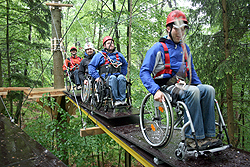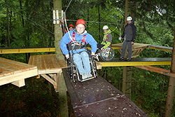 Dieser Parcours ist in den Baumbestand ein-gebettet, bis zu 11 Meter Höhe über den Waldboden, dabei sind Neigungen und Steigung des Parcours barrierefrei. |