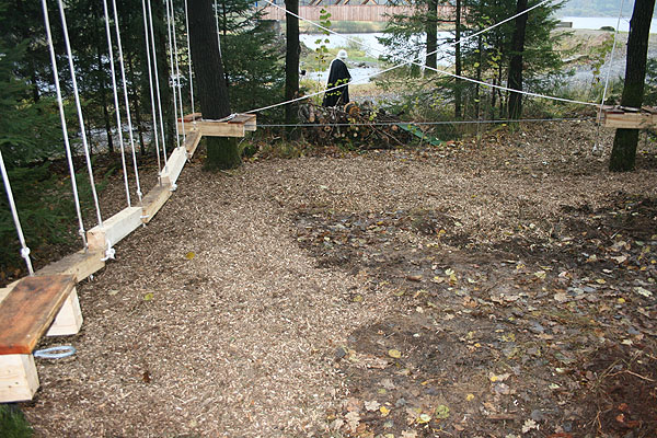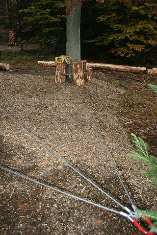 Verschiedene Seilstationen werden bis zu einer Höhe von ca. 60 cm gespannt. Durch das Aufeinanderfolgen diverser Übungen unterschiedlicher Länge und Schwierigkeit mit "Festhaltmöglichkeiten" werden Balance und das Miteinander in der Gruppe geübt. |